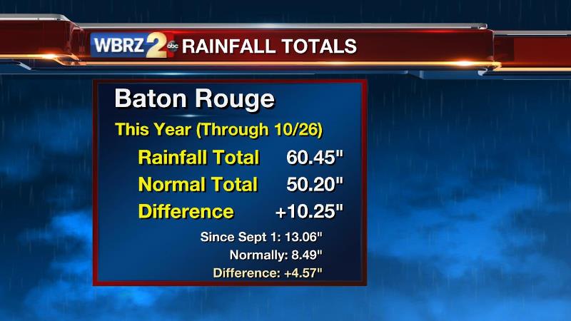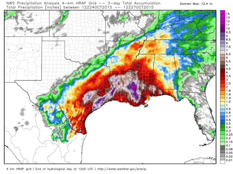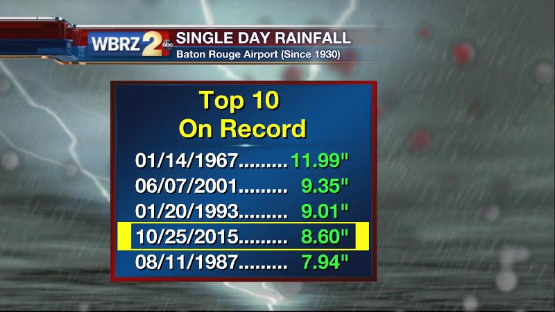 On back to back days, Oct. 24 and 25, Baton Rouge set daily rainfall records of 2.14 inches and 8.60 inches—the latter of which was the fourth largest single day total in the city’s recorded history. The cause could be traced to an upper low that tapped into an abundant moisture source via the remnants of Hurricane Patricia.