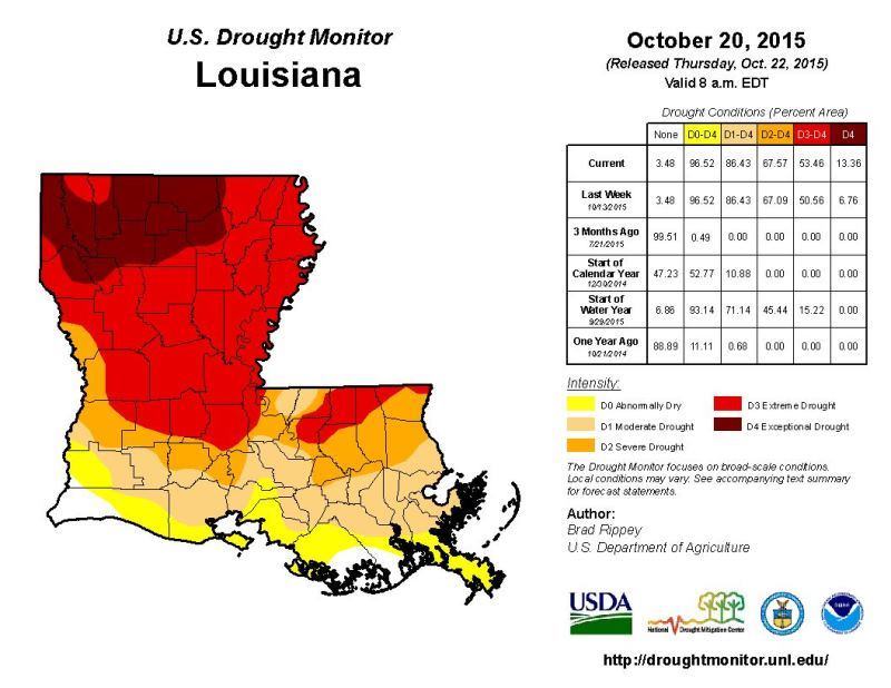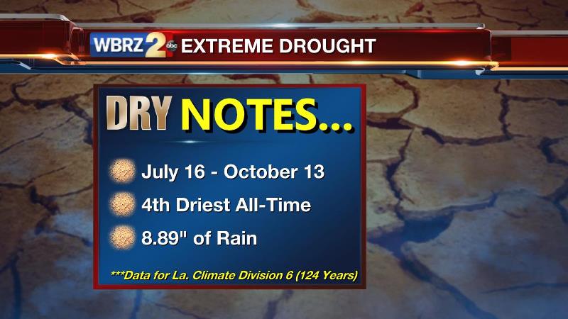 Summer was dry. Typical afternoon convection was squashed by a persistent mid-level ridge from July to October. A comfortable annual rain surplus evaporated to nil by Early Autumn. Extreme to exceptional drought plagued Louisiana over that three month period with Louisiana’s sixth climate division, including the city of Baton Rouge, running almost 9” shy on usual rainfall through the period. Less than an inch of rain fell along the I-10/12 corridor from Mid-September into Mid-October. That dryness and low humidity combined with gusty winds helped to fuel a number of wildfires across portions of northern Louisiana. Statewide burn bans were issued. In Mississippi, field reports mentioned that the planting of winter grazing fields had been delayed. Crop yields were down, cattle producers had to hay feed much earlier than usual due to loss of green forage, general farm ponds receded, and many established landscape trees and shrubs were damaged.