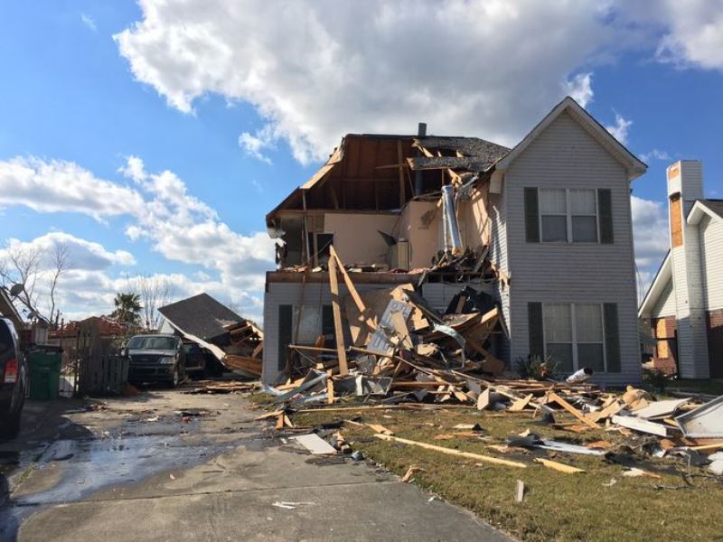 The tornado touched down near the New Wine Fellowship removing much of its roof covering. It snapped power poles as it moved across Airline Highway and then moved into a retail area where it blew out windows and removed roof covering and fascia from several buildings. The tornado was at its widest around this time with a width of 250 yds. Damage in this area was consistent with EF-1 wind speeds. The tornado then continued northeast into the Carrollwood area causing a broad area of EF-0 and EF-1 damage. Large trees were snapped and several homes suffered roof damage mostly consisting of loss of shingles and some decking. The tornado continued northeastward into the Riverland Heights Subdivision. The most substantial damage in this area was along Greenwood Drive where the tornado was moving roughly parallel to the street. Many homes suffered roof damage and a few lost portions of the roof structure. Two homes suffered the collapse of a single exterior wall but it was noted that the damage was likely a result of garage door failures allowing the wind to lift the roof off from inside and then pushing the exposed wall out. Very little damage was noted to the tops of the standing walls despite the entire roof being torn away. The tornado contracted slightly with a width of approximately 200 yards at this point. The tornado continued northeastward and intensified a bit as it reached the Cambridge Area. In this area, a narrow stretch of EF-2 damage was noted near the intersection of Heritage Cove and Virginia Colony Avenue. Here, a few homes and duplexes suffered partial to total loss of roof structure and decking, partial exterior wall failures and blown out windows. This damage occurred with no apparent failures of patios/porches or garages. We believe the damage in this area to be consistent with peak winds around 115 to 120 mph. The tornado continued to strengthen as it moved through a wooded area and emerged into the Palmetto and Indigo Estates Subdivisions. This is where the worst damage along the path occurred. Near the intersection of Nicole and Gail Streets, two single story homes suffered complete roof loss as well as total failure of most exterior walls. A third home lost about half of its second floor. Damage in this area is consistent with a strong EF-2 wind speeds near 130mph. Two other homes on Sawgrass Drive suffered total roof loss and partial failure of exterior walls. The tornado continued northeastward causing damage to a large metal building at which point the tornado began to rapidly weaken. It crossed Interstates 10 and 55 causing damage to trees and the last damage was observed near Frenier Road and U.S. Highway 51 where a light pole was snapped and tree branches were broken.