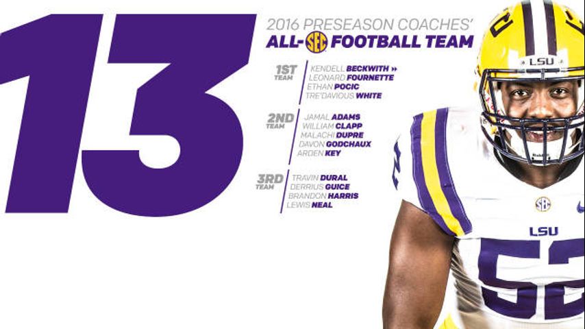 BATON ROUGE - LSU football tied for the most selections on the 2016 Preseason Coaches All-SEC Football Team with 13 players making the cut, according to the league office on Thursday morning.