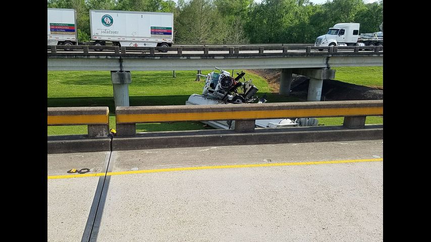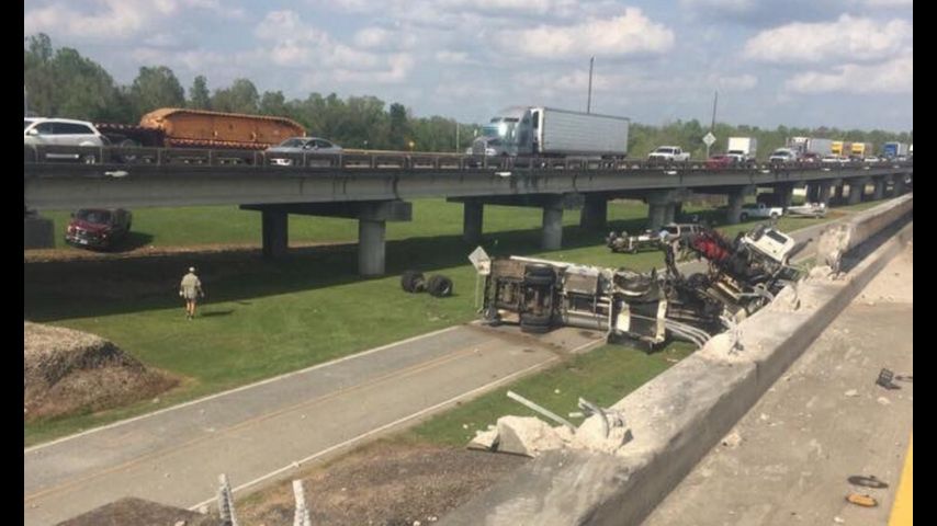 The crash occurred around 4:40 p.m., destroying the barrier and dropping the 18-wheeler on the roadway below. Louisiana State Police say the truck drove off the bridge near the Butte La Rose exit.