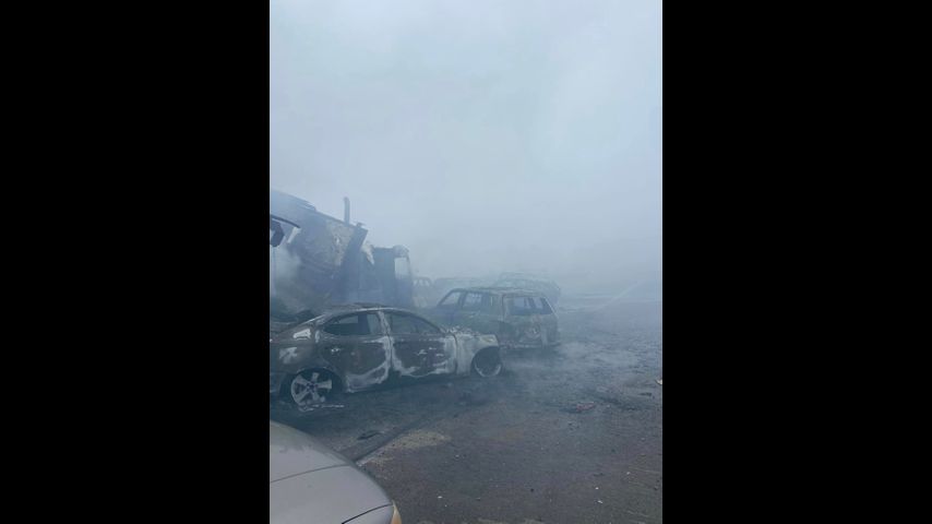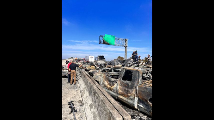 Mangled vehicles caught on fire during the pileup. Seven people died on Monday and one more person who was injured died in the hospital on Tuesday.