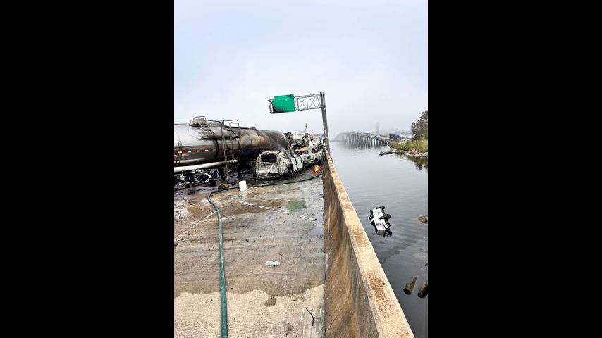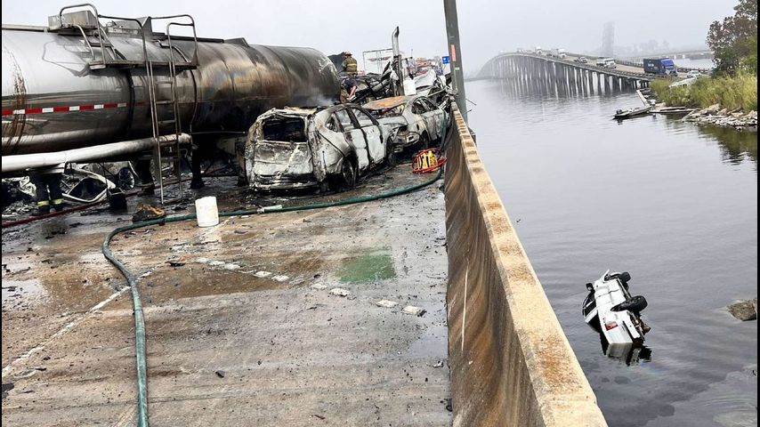 Video from social media showed vehicles packed together in a mangled mess involving several dozen cars and trucks. Police said one driver had to escape a partially submerged truck after it went over the side of the bridge and into the water below.