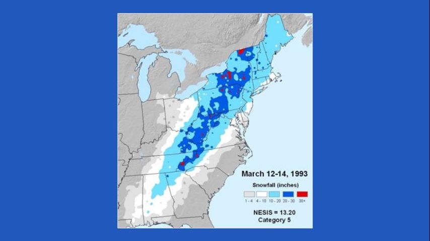 On March 11–14, 1993, a massive storm system bore down on nearly half of the U.S. population causing approximately $5.5 billion in damages ($9.2 billion in 2016 dollars). That storm swept from the Deep South all the way up the East Coast. With a central pressure usually found only in Category 3 hurricanes, the storm spawned tornadoes and left coastal flooding, crippling snow, and bone-chilling cold in its wake. Of the more than 200 weather and climate events with damages exceeding $1 billion since 1980, this storm remains the country’s most costly winter storm to date.