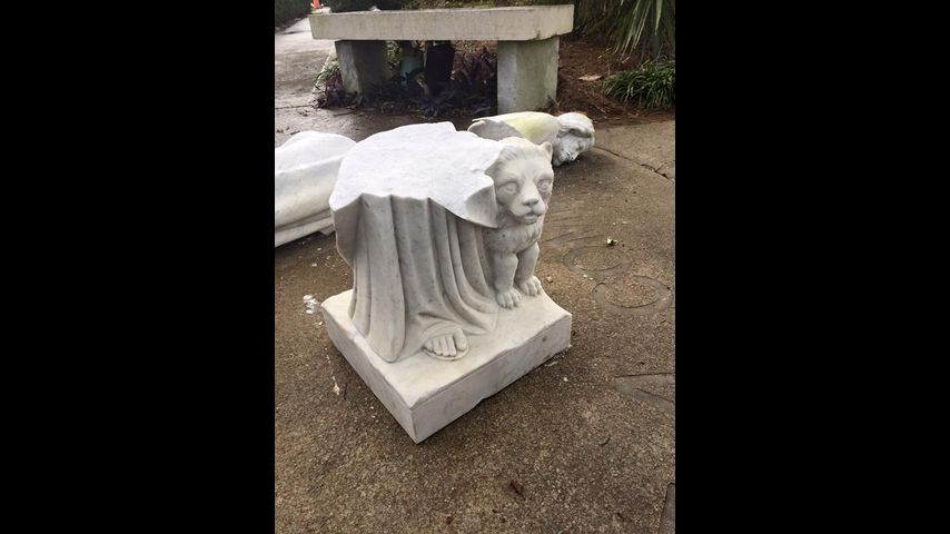 The statue was of Saint Mark located at the Saint Mark Catholic Church in Gonzales. Pictures show parts of the statue broken to pieces on the ground.