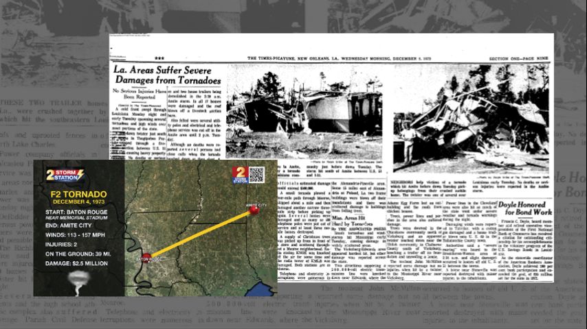 On December 3, 1973, a tornado initially touched down around 1:30am in East Baton Rouge Parish before finally lifting in Tangipahoa Parish at 2:45am. According to the Tangipahoa Parish Sheriff’s Office, about 15-20 homes were destroyed or severely damaged by the narrow tornado.
