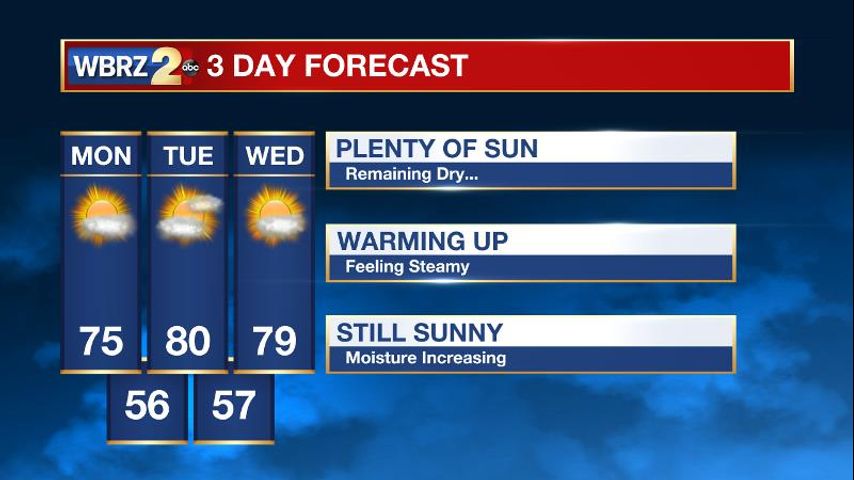 Up Next: High pressure will remain in control for the next 72 hours providing plenty of sunshine and temperatures warming to near 80 degrees by Tuesday afternoon. Tuesday's low temperature will sink once again to the middle 50s in the overnight hours and patchy fog is likely to be a problem in the nocturnal and early morning hours. The next storm system will move through the region late Wednesday night into early Thursday morning bringing a light round of showers by early daybreak on Thursday. The return of Gulf moisture will be limited with this system, and therefore the rain shower activity will be limited and no severe weather will be expected with it's passing. A cold front will once again sweep through the area on Thursday morning leaving plenty of sunshine and comfortable temps in it's wake. The weekend is looking rain-free with plenty of sunshine along with comfortable temperatures climbing to the upper 70s for Friday, Saturday and Sunday. Plan for your outdoor activities and stay tuned to WBRZ for the latest weather updates.
