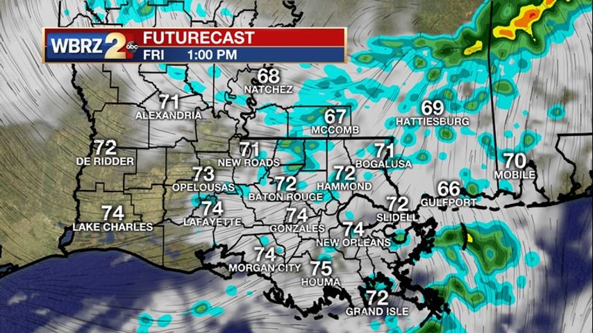 Today and Tonight: A broken frontal system will be pushing through our area, but should stay rather fragmented as it nears the Gulf Coast. Spotty showers will be possible through the morning and afternoon hours, as rainfall tapers off around 6 PM. Rain amounts will be low, only accumulating to near 0.1” east and north of Baton Rouge. Temperatures will be rather warm, as highs top out near 76° with southeasterly winds of 5 to 10 mph. Drier conditions tonight, but clouds will be sticking around. These clouds will keep temperatures from cooling quickly, as lows will only reach near 54° with calm winds out of the north.