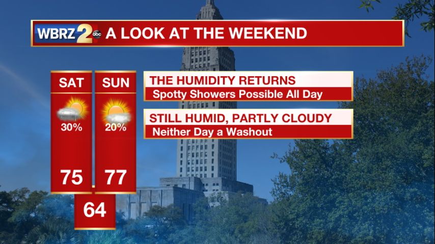Today and Tonight: After a much warmer start to the day today, temperatures will be in the upper 70s this afternoon. A few places south of Baton Rouge will likely hit the low 80s. There will be few coastal showers this afternoon, and humidity will be returning. We will start to feel it tonight when lows only drop into the 60s.