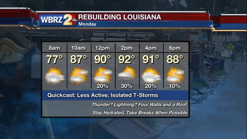 Today and Tonight: For one more afternoon, expect scattered showers and thunderstorms across the area. Rain coverage for the 13 Parishes and 3 Counties will end up in the 30-percent range. The best bet for a shower will be south of I-10. High temperatures will still manage the lower 90s with no break in humidity. Overnight, a partly cloudy sky is expected as lows fall into the mid 70s.