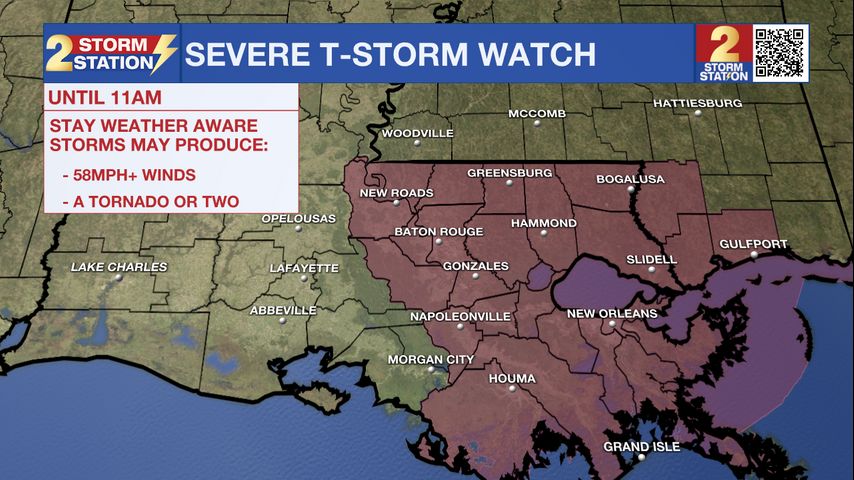 The National Weather Service has issued a Severe Thunderstorm Watch for East Baton Rouge, West Baton Rouge, Ascension, Assumption, Iberville, East Feliciana, Livingston, Pointe Coupee, St. Helena, St. James, St. Mary, Tangipahoa, and West Feliciana Parishes.