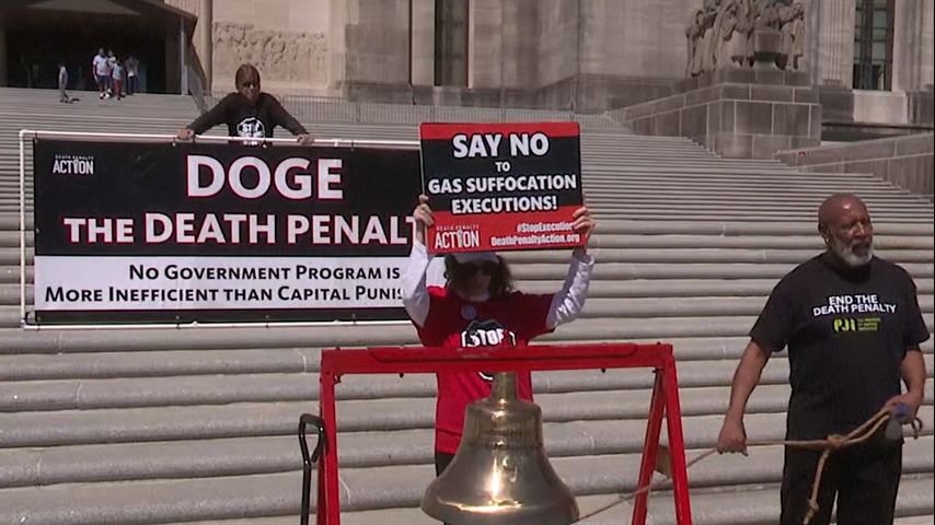 Activists from Death Penalty Action stood on the steps of the State Capitol in front of a sign advocating to "DOGE the death penalty," referencing the ongoing initiative spearheaded by Elon Musk with the expressed goal of reducing government spending.