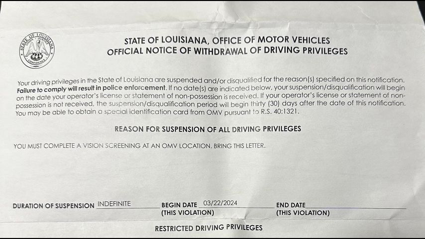 BATON ROUGE - About 2,500 drivers who visited a private tag agent in the Baton Rouge area were mailed letters threatening police enforcement if they failed to get an eye exam.