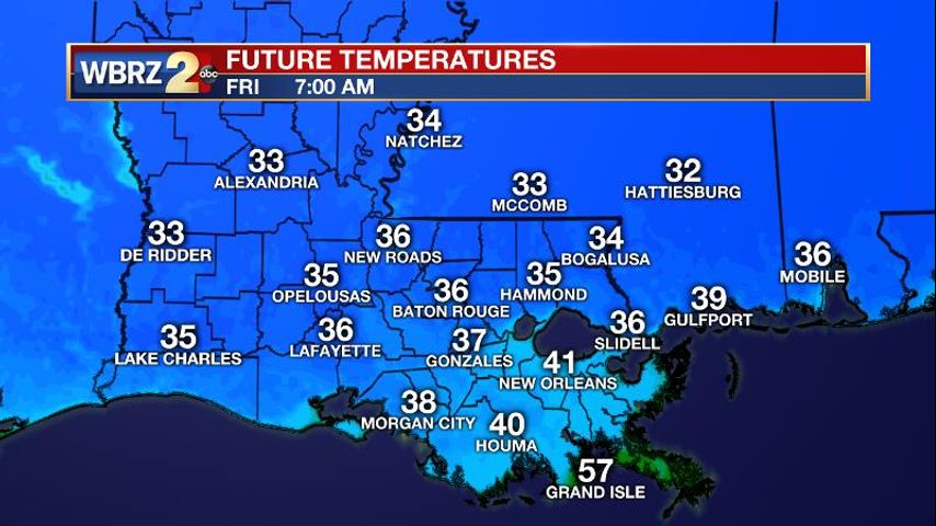 The Next 24 Hours: With just a few thin clouds and light winds, the coldest temperatures of the week will occur on Friday morning with mid 30s for most and some areas north of I-12 challenging freezing. More sun is in the forecast to end the week with after thermometers squeaking into the low 60s.