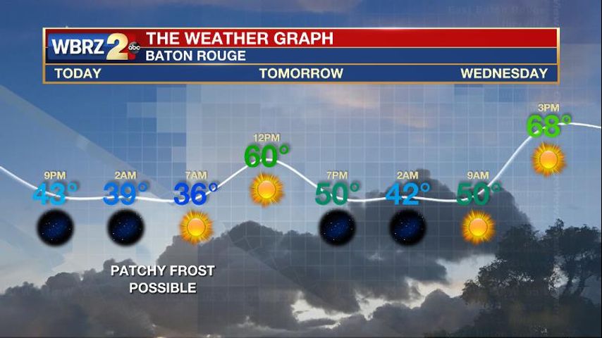 The Next 24 Hours: A clear and cold night is ahead. Expect low temperatures in the mid to upper 30s across the Baton Rouge area. This means that the typically cooler locations north and east of the city could experience some patchy frost. Tuesday afternoon, ample sunshine will rebound high temperatures into the low to mid 60s. Winds will be light and westerly.