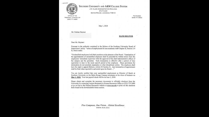 “It was my goal to uphold the prestigious legacy of the Human Jukebox by taking the band to greater heights of unprecedented success,” Nathan Haymer said in a statement about his termination. “I always took pride in being an ambassador for Southern University and at no time did I ever act in a nefarious manner by accepting 'kickbacks' as falsely reported by the media.”