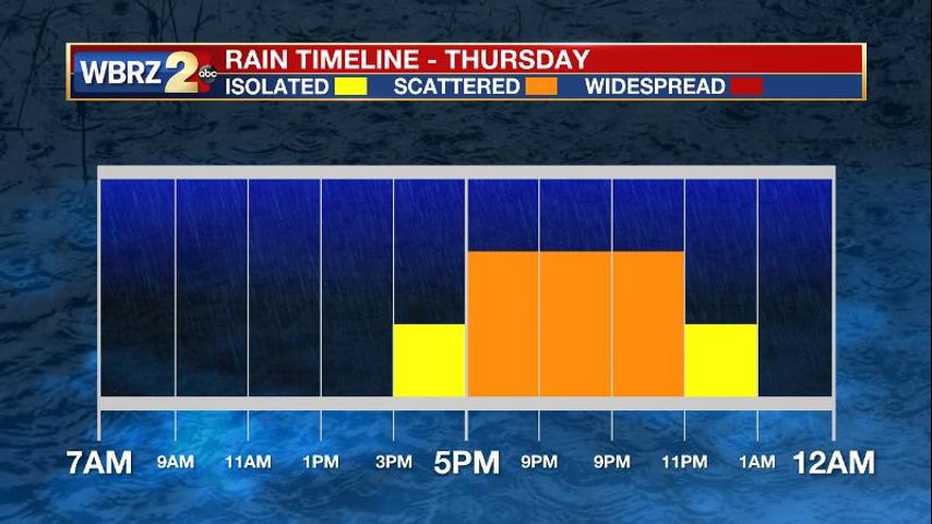 Today and Tonight: Thursday's high temperatures will reach the upper 70s and low 80s beneath mostly cloudy skies. A cold front will push into the area during the afternoon and evening with a bout of rain and possibly an embedded thunderstorm. Most locations should receive rain, but it will be short-lived and light. The estimated timeline is 4pm -10pm from northwest to southeast across the WBRZ Weather forecast area. Activity is anticipated in the Baton Rouge area around 6pm. This front will result in quickly falling temperatures overnight as winds shift northerly. By morning, most of the showers should be wrapped up with thermometers in the low 50s and upper 40s.