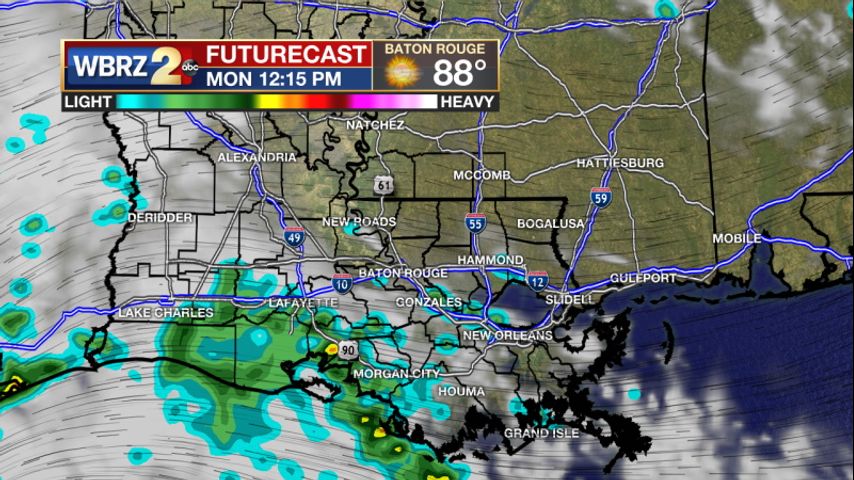 Today and Tonight: We will be starting the week with some scattered showers. Staring in the afternoon, showers will form near the coast and largely on the west side of the Mississippi River. A few more isolated showers are possible further east. About 40% of our viewing area will see some rain today. There is plenty of available moisture for a few heavy downpours, gusty wind, and lightning. Temperatures will heat to near 93 degrees and overnight cooling to near 76.