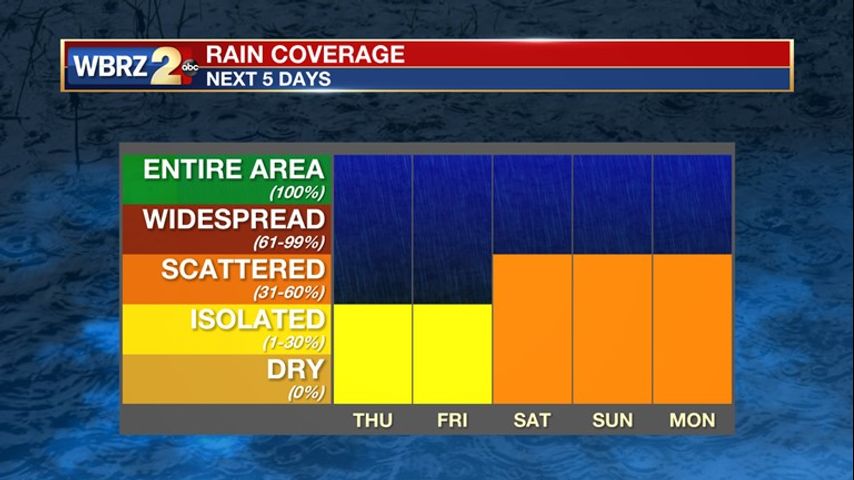 Up Next: Spotty to isolated showers and storms will develop through the afternoon Thursday and Friday, with rain chances increasing slightly over the weekend.