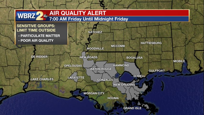 An *AIR QUALITY ALERT* has been issued for the Baton Rouge area for today (Friday). Light morning winds will reduce pollutant dispersion, and continued warm temperatures and sunny skies will enhance ozone formation. Therefore, air quality levels will be Unhealthy for Sensitive Groups in the Baton Rouge area. You can help mitigate this issue and reduce emissions by driving less and refueling very early or very late in the day.