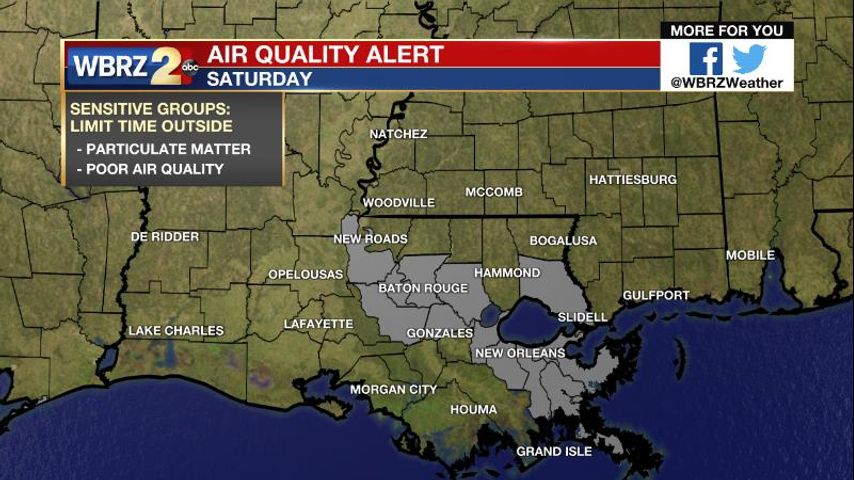 An AIR QUALITY ALERT is in effect from 6am Saturday through Midnight for East Baton Rouge, West Baton Rouge, Livingston, Ascension, Iberville and Pointe Coupee Parishes. Active children and adults, the elderly and people with respiratory diseases such as asthma, should avoid prolonged outdoor exertion.