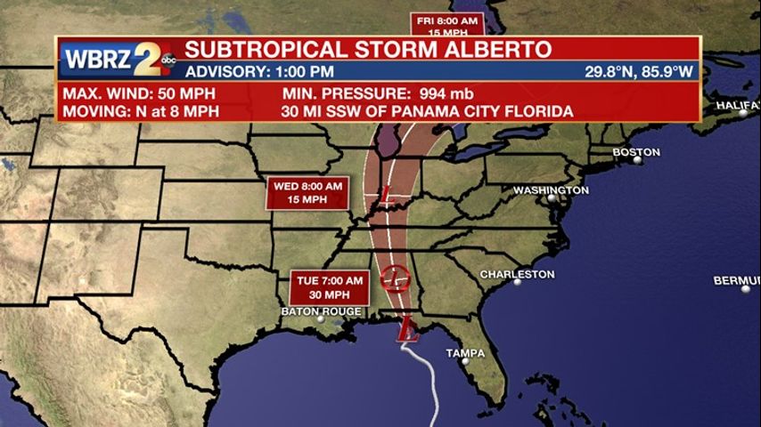 As of 1 PM Monday afternoon, Subtropical Storm Alberto was located 50 miles south-southwest of Panama City, Florida, with a minimum central pressure of 994mb and maximum sustained winds of 50mph and was moving north at 8mph. A quicker north-northwestward motion is expected over the next several days. The center of Alberto will be making landfall later this afternoon just west of Panama City between 1-5 PM. Substantial rainfall amounts will extend from Florida through the Carolinas and into the north east toward the latter half of the week.
