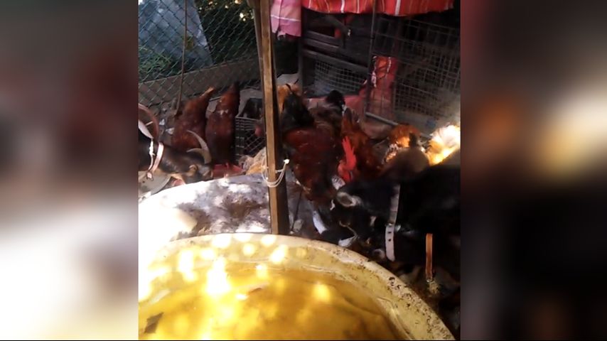 Video shared the by the Humane Society shows more than a dozen chickens and goats being kept in a tiny, fenced-in area on the property.