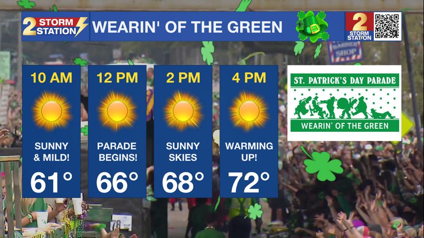 Tonight & Tomorrow: Skies will rapidly clear this evening and remain that way overnight. A drier and cooler air mass will push in with lows settling into the low 50s. Just in time for 40th Wearin’ of the Green Parade and St. Patrick’s Day festivities, Sunday will bring a major shift in the weather—cooler, drier air will settle in, dropping highs to a comfortable 73°F with plenty of sunshine. A steady 15-20 mph breeze will make it feel even cooler. If you're heading to the parade, grab a light jacket!