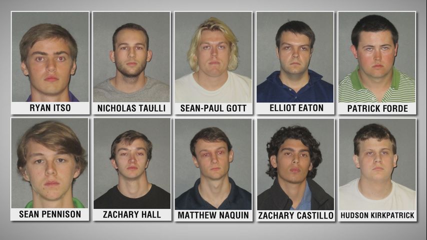 Arrested were: Matthew Alexander Naquin; Zachary Castillo; Elliott Eaton; Patrick Forde; Sean Paul Gott; Zachary Hall; Ryan Isto; Hudson Kirkpatrick; Sean Pennison; and Nicholas Taulli.
