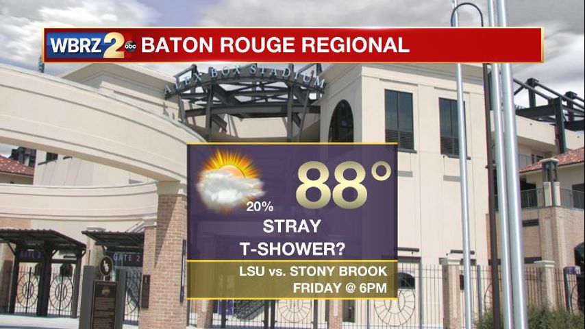 Baseball Regionals: LSU may have to dodge lingering showers on Friday evening during their matchup with Stony Brook. This chance is low and there is no real threat for a washout. Regardless, it will be muggy with temperatures in the mid to upper 80s. Southern will face a lower chance of rain in Starkville with thermometers in the mid 80s for their noon start against Mississippi State.
