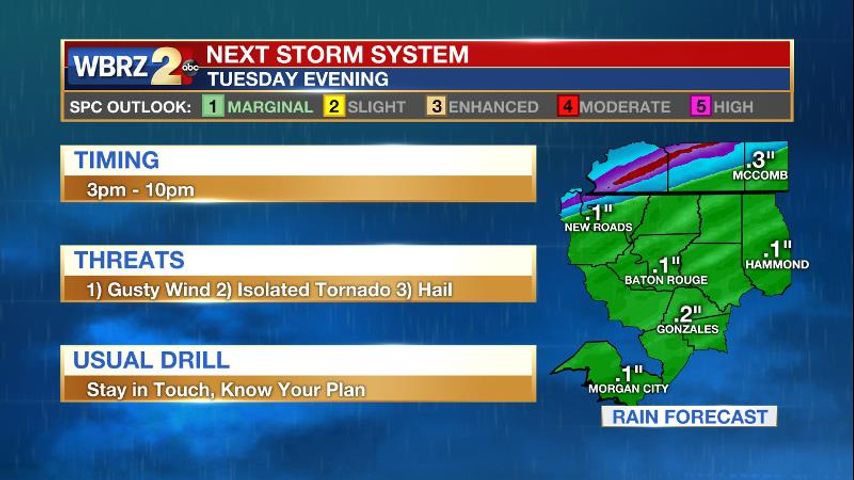 Precipitation: Generally, less than a half inch of rain is expected, though a locally higher amount could occur within the 13 Parish, 3 County Forecast Area—especially where the heaviest storms occur.