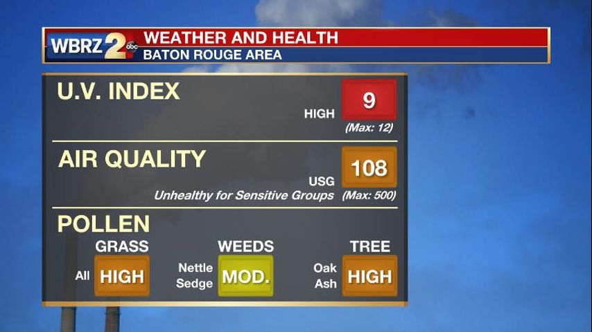 When the weather is nice and quiet, we are more prone to some negative health impacts. Clear skies are often created by areas of high pressure, which also result in sinking, poorly mixed air. This makes it difficult for clouds and showers to form but also allows pollutants to settle and ozone to increase. An *AIR QUALITY ALERT* has been issued for the Baton Rouge area from 6am through midnight Wednesday. Levels are low enough that only those with breathing sensitivities such as asthma would be affected by spending longer periods outside. You can reduce emissions by driving less and refueling very early or very late in the day. In addition, the U.V. Index is very high at 9, making sunburn times less than 20 minutes. Also, grass and tree pollen is high.