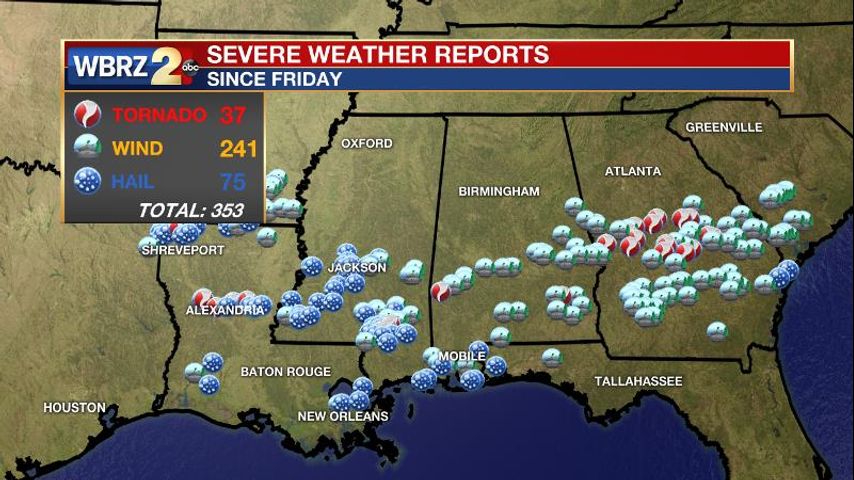 All things considered, the local area fared very well amidst an outbreak of severe weather all across the Southeast. Deadly tornadoes struck as close as Hattiesburg, MS., with reports of damaging wind and large hail all around. Despite a multitude of tornado and severe thunderstorm warnings on Friday Night and Saturday Evening, no damage reports have come in to the WBRZ Weather Team or the local National Weather Service. Thanks to the heavy rain on Thursday and Friday Night, some area rivers are bulging, cresting only just above their banks—this is a more "normal" type of river flooding (unlike August) that we see a few times each year.