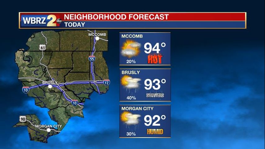 Today and Tonight: The chance for showers and thunderstorms will diminish for eastern locations on Tuesday. Some activity will develop south and west of Baton Rouge and thanks to the tropical nature of the showers, brief downpours could lead to some nuisance street and poor drainage flooding. Some sun and warm temperatures are also expected. Highs will be near 93 with lows near 75.