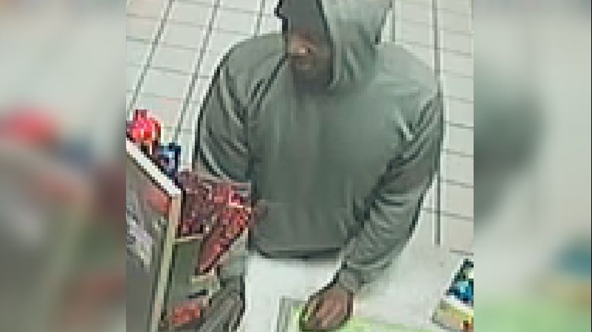 The suspect is approximately 5'10" and 180 pounds, in his 50s and has gray facial hair. At the time of the robbery, he was seen wearing dark colored jeans, a gray hooded sweatshirt, and a black beanie.