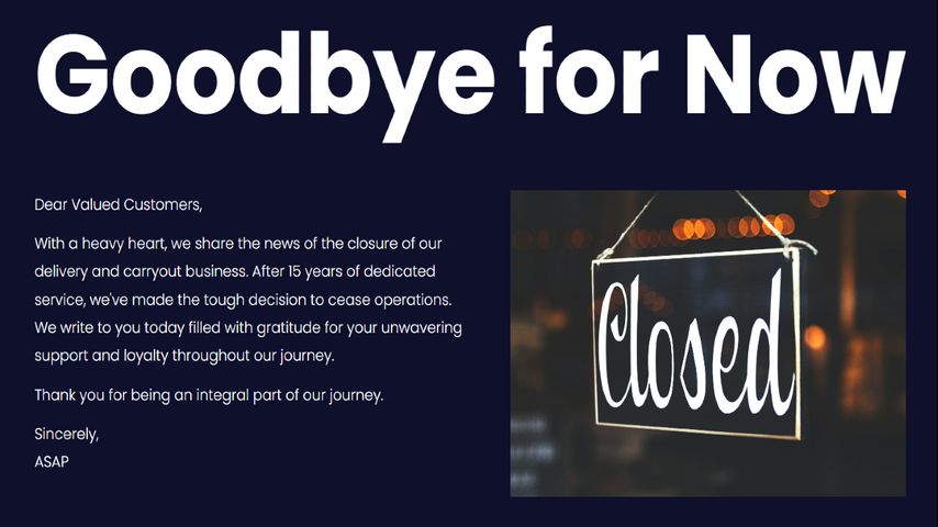 With a heavy heart, we share the news of the closure of our delivery and carryout business. After 15 years of dedicated service, we've made the tough decision to cease operations. We write to you today filled with gratitude for your unwavering support and loyalty throughout our journey.