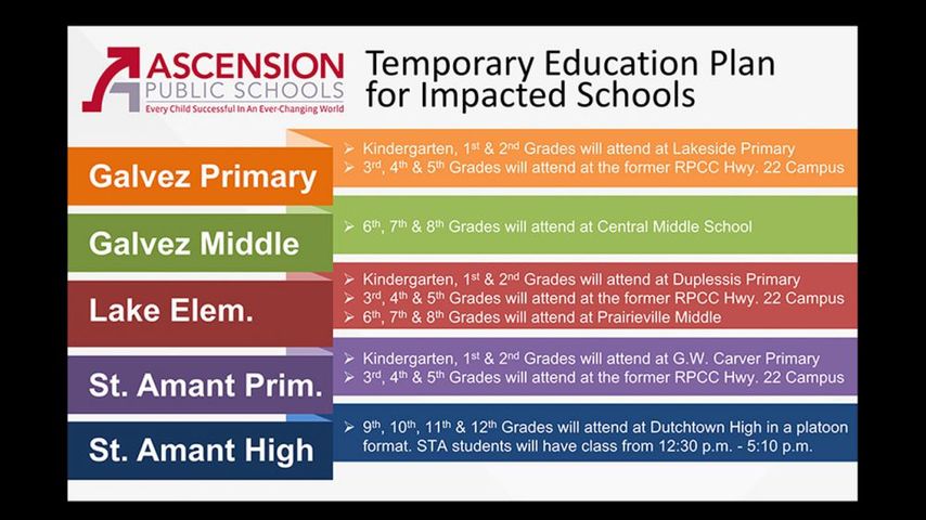 ASCENSION PARISH - Ascension Parish Public Schools released their temporary education plan for schools that are currently under remediation due to flood waters so that students can continue their education at alternate locations.