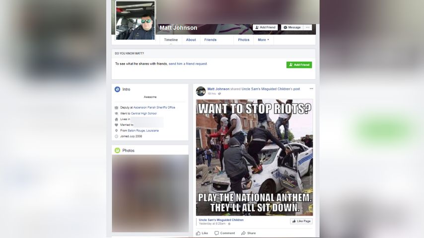 A photo sent to the sheriff's office and WBRZ shows the deputy sharing a photo concerning people who protest during the national anthem.