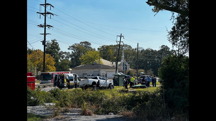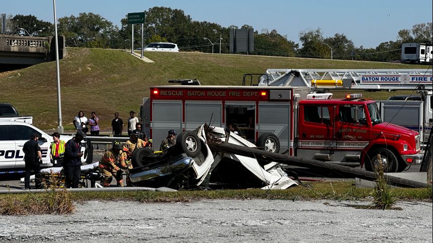 BATON ROUGE - Three people were rushed to a hospital after a pickup truck seemingly wrapped itself around a utility pole along Scenic Highway.