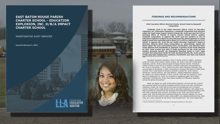 BAKER - A legislative audit found operators of the Impact Charter School, d.b.a. Education Explosion, may have mismanaged nearly $2.5 million in funds intended for education, the WBRZ Investigative Unit uncovered.