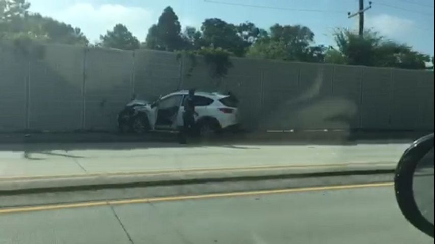 Video shows that a vehicle crashed into the noise barrier wall along the roadway.
