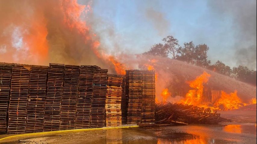 Upon arrival, crews found large stacks of pallets burning. Photos show flames rising above the tree line, with massive smoke clouds and hundreds of pallets on fire outside the business.