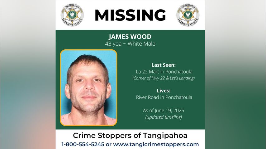 TPSO says James Wood, 43, was last seen at the La 22 Mart at the corner of Highway 22 and Lee's Landing on Saturday, June 21, wearing all black. His car, keys and other belongings were found at his home in the 40000 block of River Road in Ponchatoula, but no one has seen or heard from him.