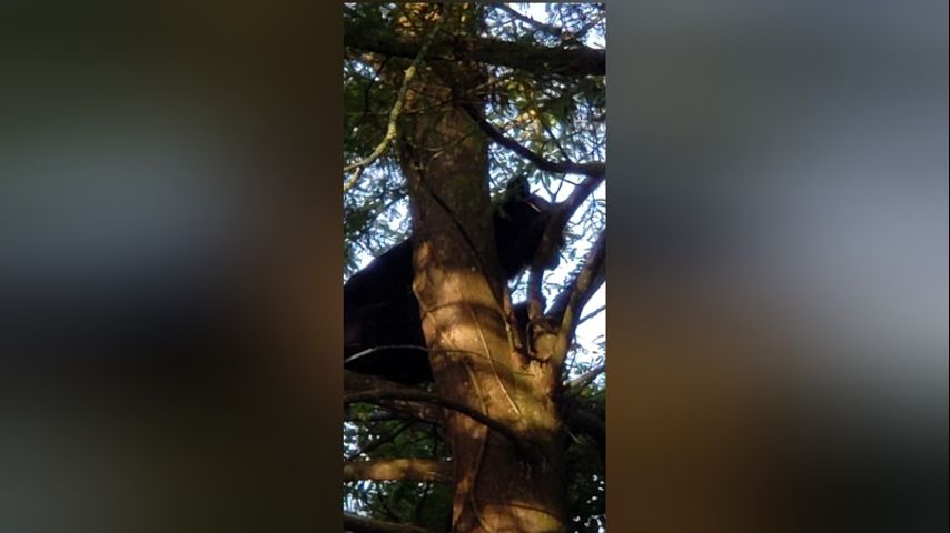 Law enforcement has baited a cage for the animal in hopes of relocating it to a safer area. They say the bear will most likely try and leave its temporary perch at some point this evening.