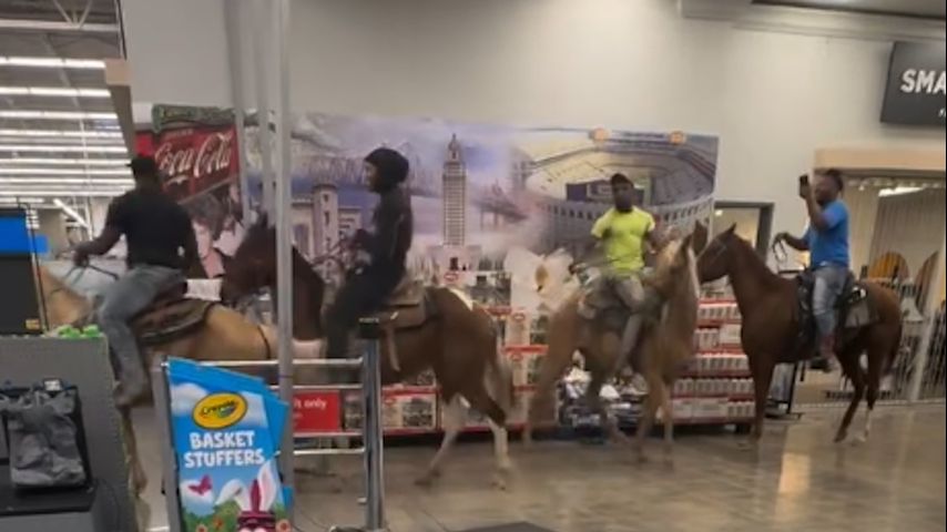 Video posted to social media showed four people on horses riding through the Walmart in Baker.