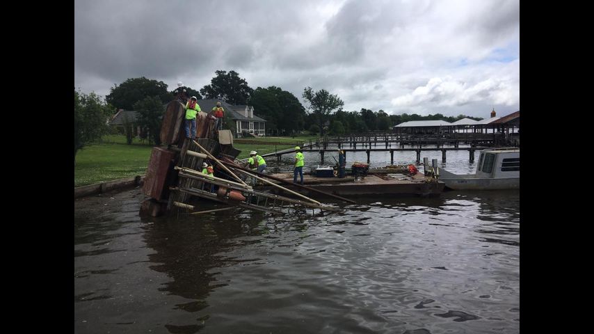 Tuesday, Coastal Bridge was working with a crew to remove the pontoon that's sticking out of the water. The crew will dismantle the barge in pieces and haul them to the other side of False River where they will be cut into pieces and recycled.