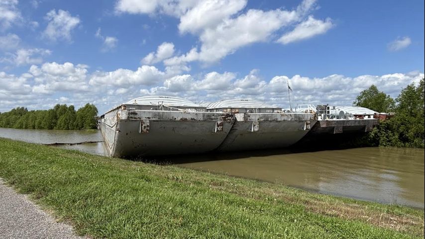 Pictures from the scene showed the barge perpendicular with the levee, and with the high river waters the boat was much closer to the levee walking path than it would be otherwise.