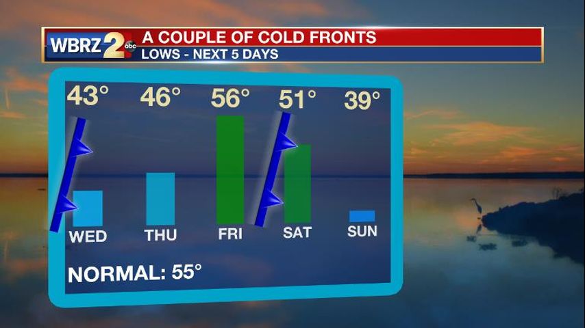 Today and Tonight: Another cold front will pass through the area on Tuesday. This one will come with little fanfare. Only a slight increase in winds is expected. Thermometers will reach the low 70s but may begin to fall even before sunset on Tuesday. Overnight lows will be in the low 40s with north winds of 5-10mph.