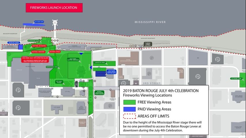 "We are excited about our community celebrating the 50th Annual WBRZ’s Fireworks on the Mississippi, which is the largest fireworks show in Louisiana,” said Mayor-President Broome. “This year, because the Mississippi River is projected to be at a level that is above the lower steps of our levee system, and because we prioritize the safety of our citizens, beginning at 5pm our public safety personnel will be prohibiting all pedestrian and vehicular access to the levee. Both our Baton Rouge Police officers and barricades will be staged along the levee so that we have a safe and enjoyable Independence Day.”