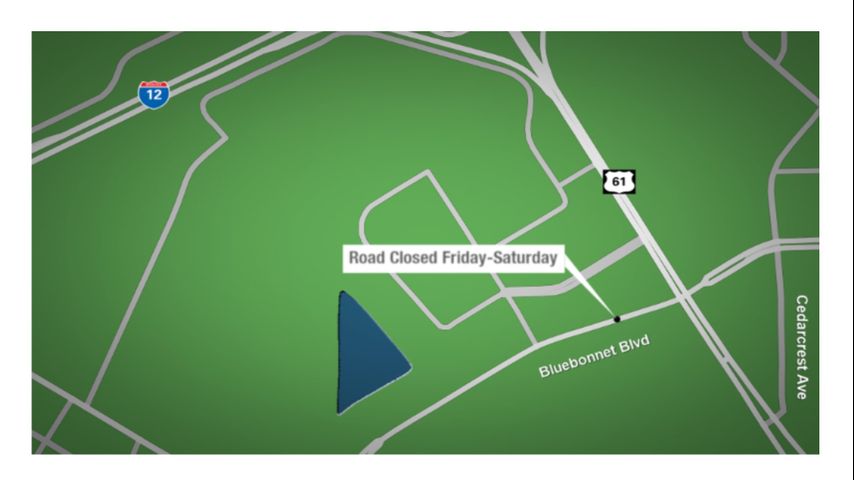 BATON ROUGE — Road crews plan to close Bluebonnet Boulevard just west of its intersection with Airline Highway after the Friday night rush hour and leave it closed through much of Saturday.